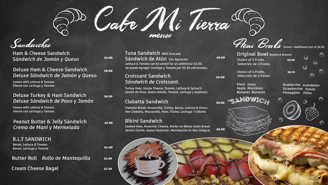 Cafe Mi Tierra offers a delectable menu that features an impressive selection of sandwiches and beverages that will make your taste buds dance. Try the Deluxe Ham & Cheese Sandwich or the B.L.T Sandwich for a savory treat. Vegetarian? The Bikini Sandwich is perfect for a light, flavorful option. If you're looking for something sweet, indulge in the Peanut Butter & Jelly Sándwich or the creamy Cream Cheese Bagel.